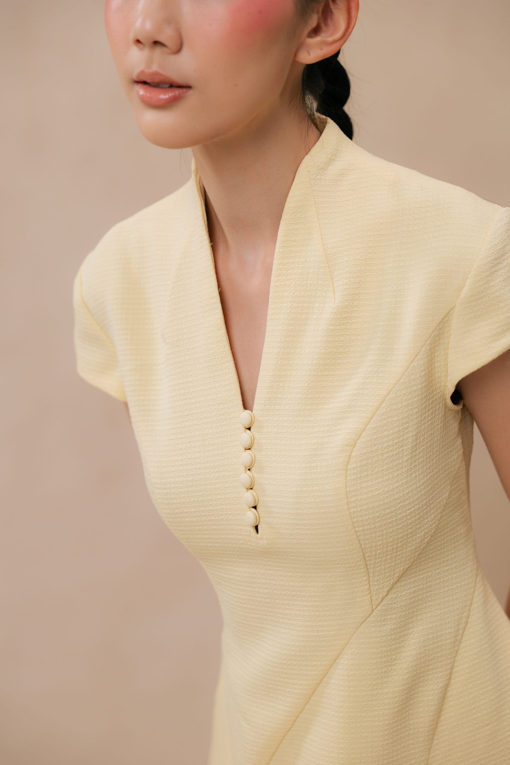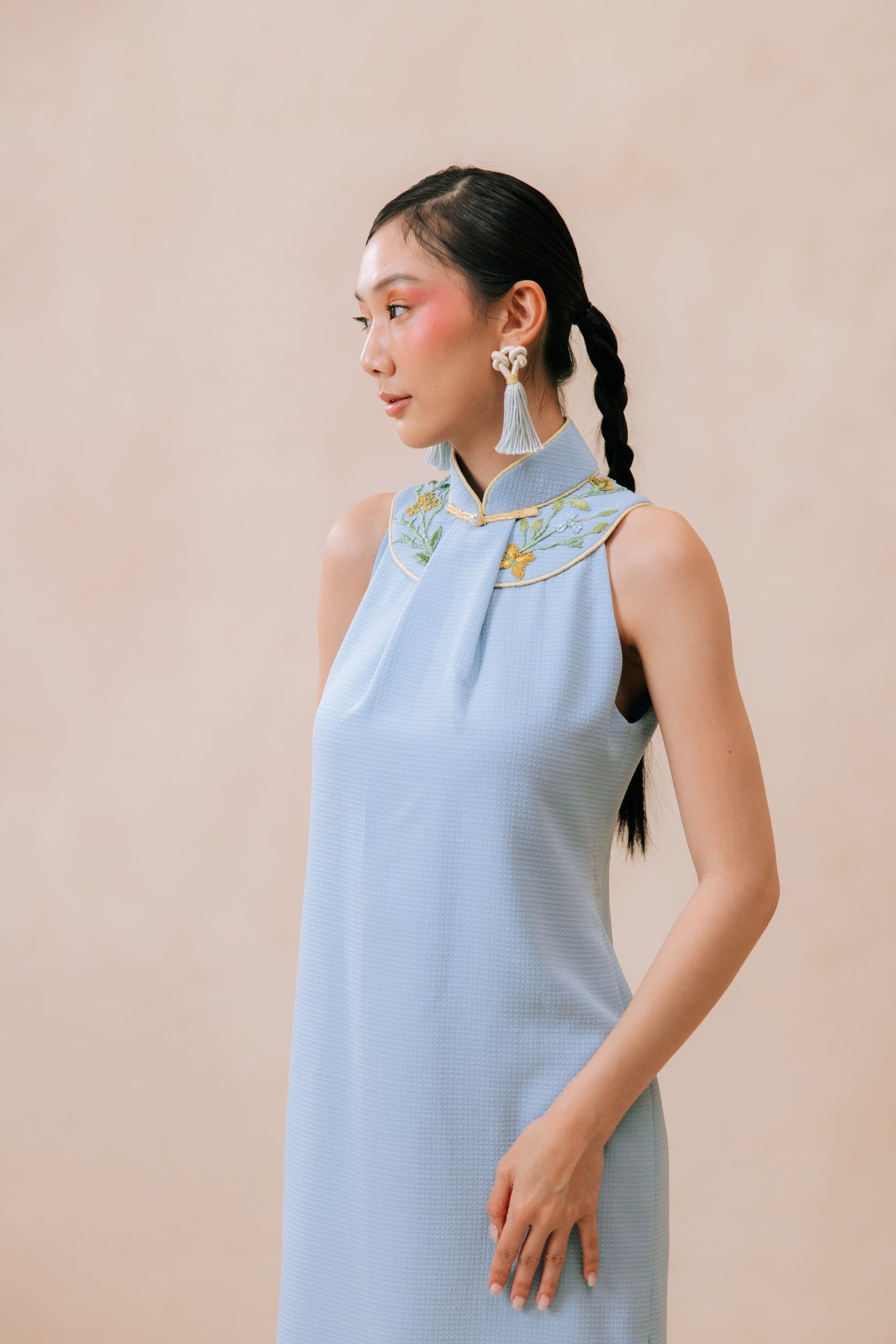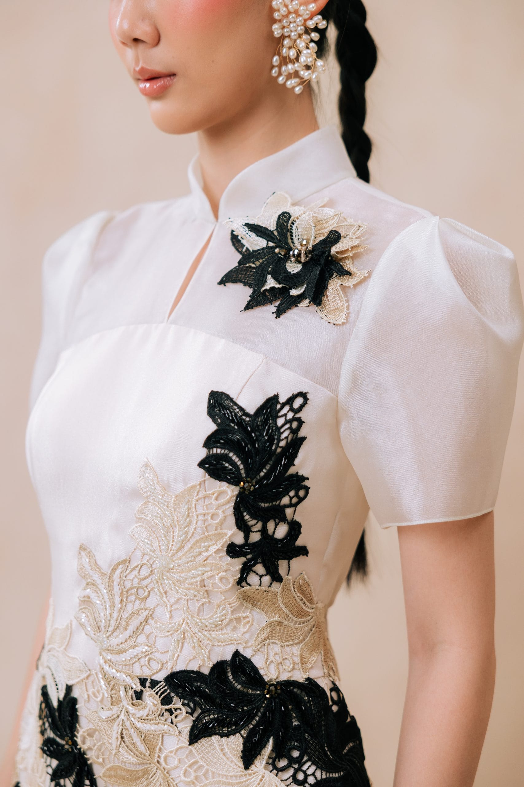 One, intricate hand sewn embroideries steals the light of ” Nanyang Journal” combining Chinese oldest craft to a modern cut and functionality. While an impeccable touch added to an otherwise perfectly cut minimalist Cheongsam with one-of-a-kind beads embroidery giving it opulent sophistication.