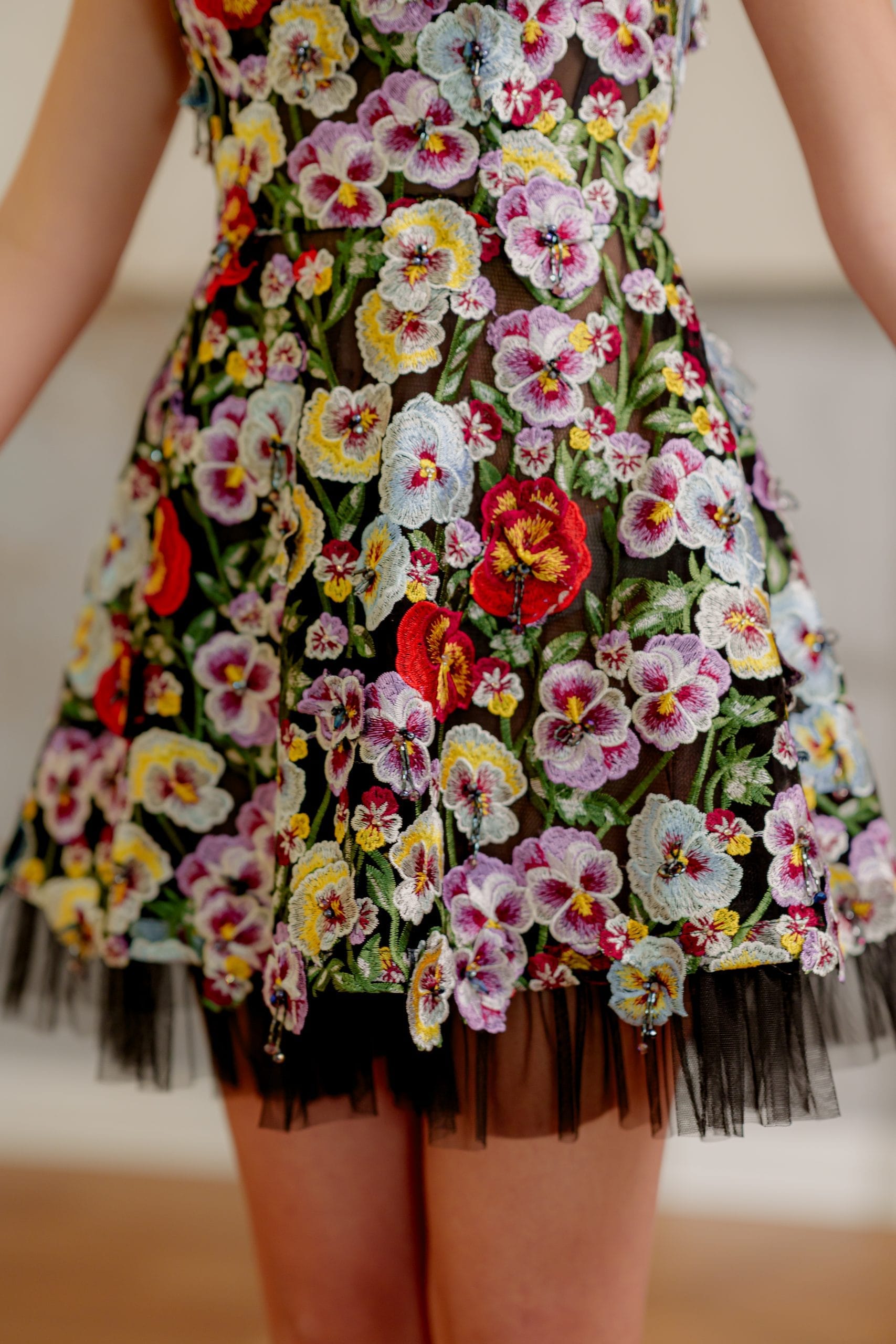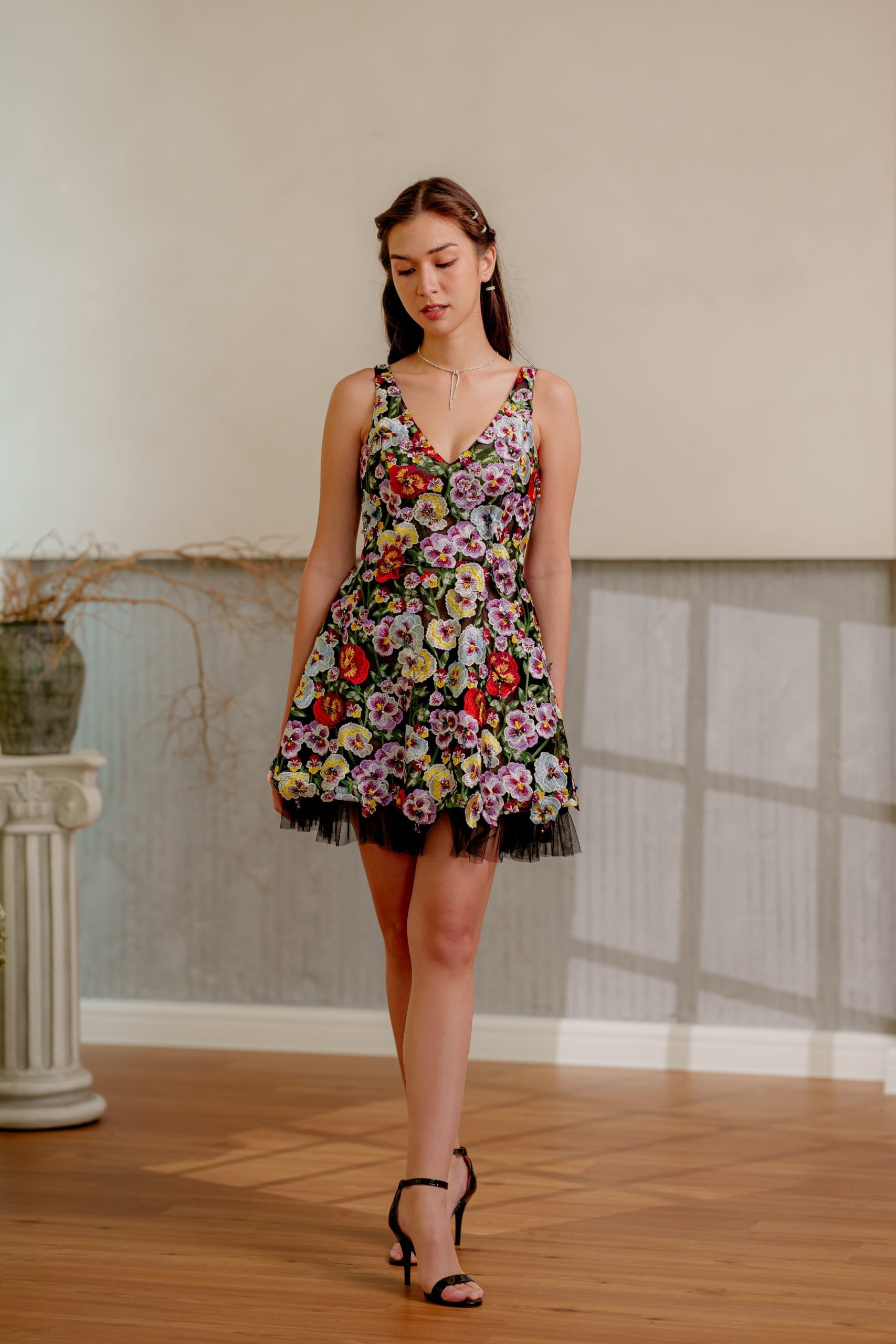Refined and chic, Charlie features V neck, floral embroidered dress on tulle