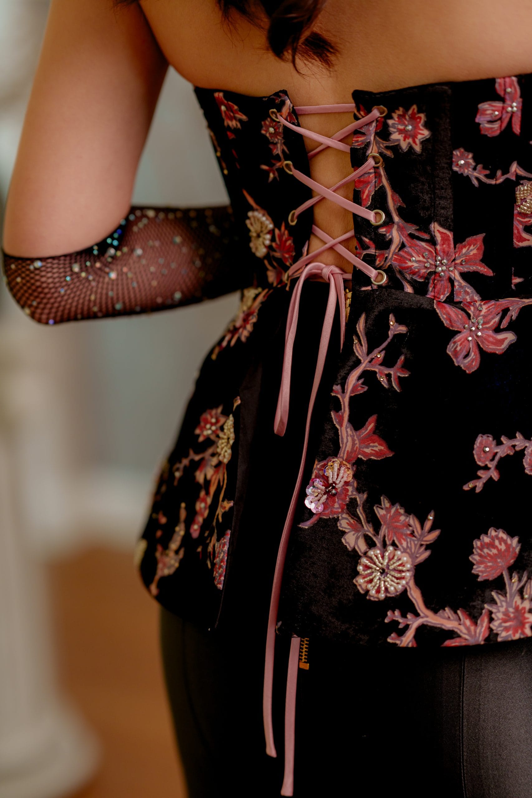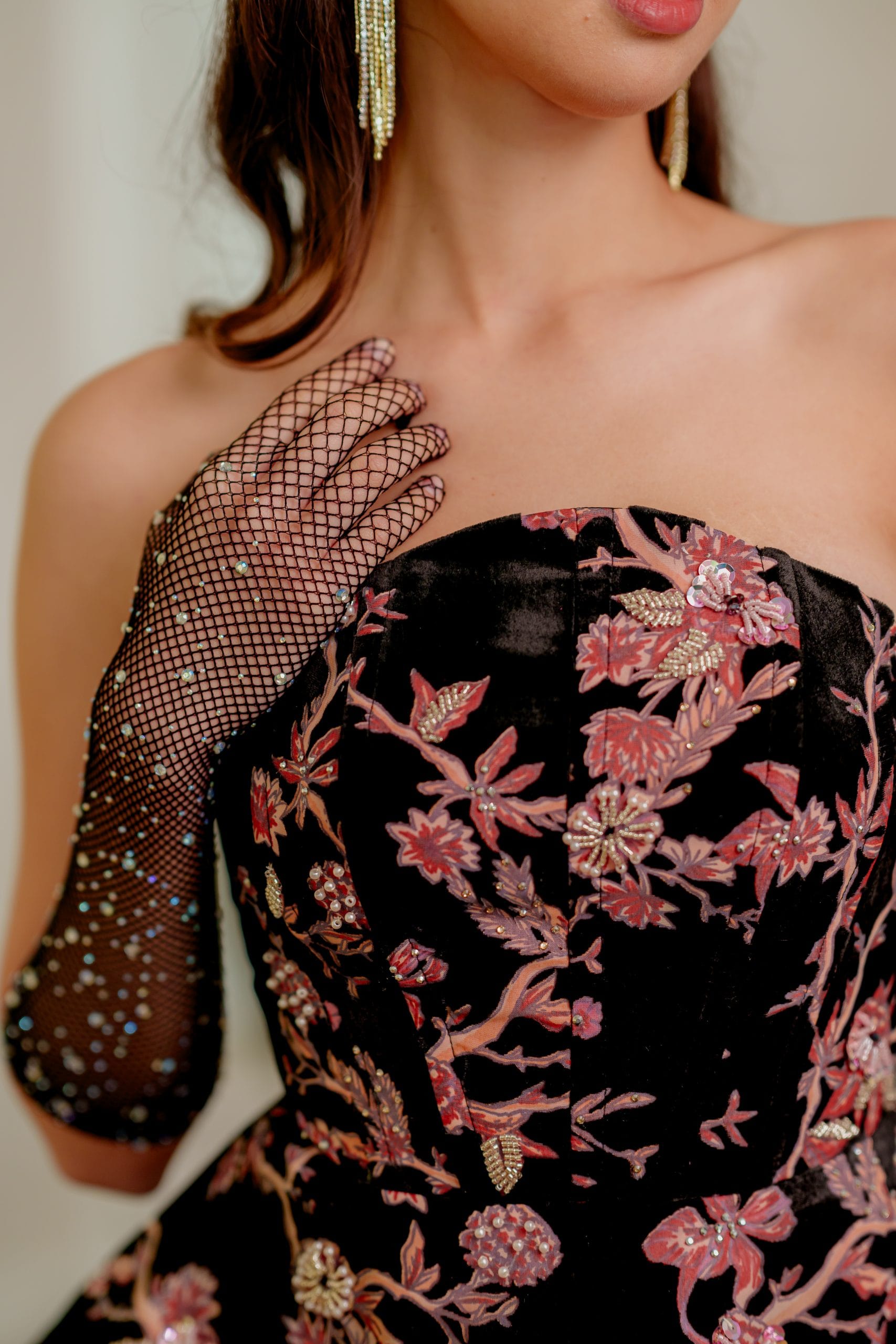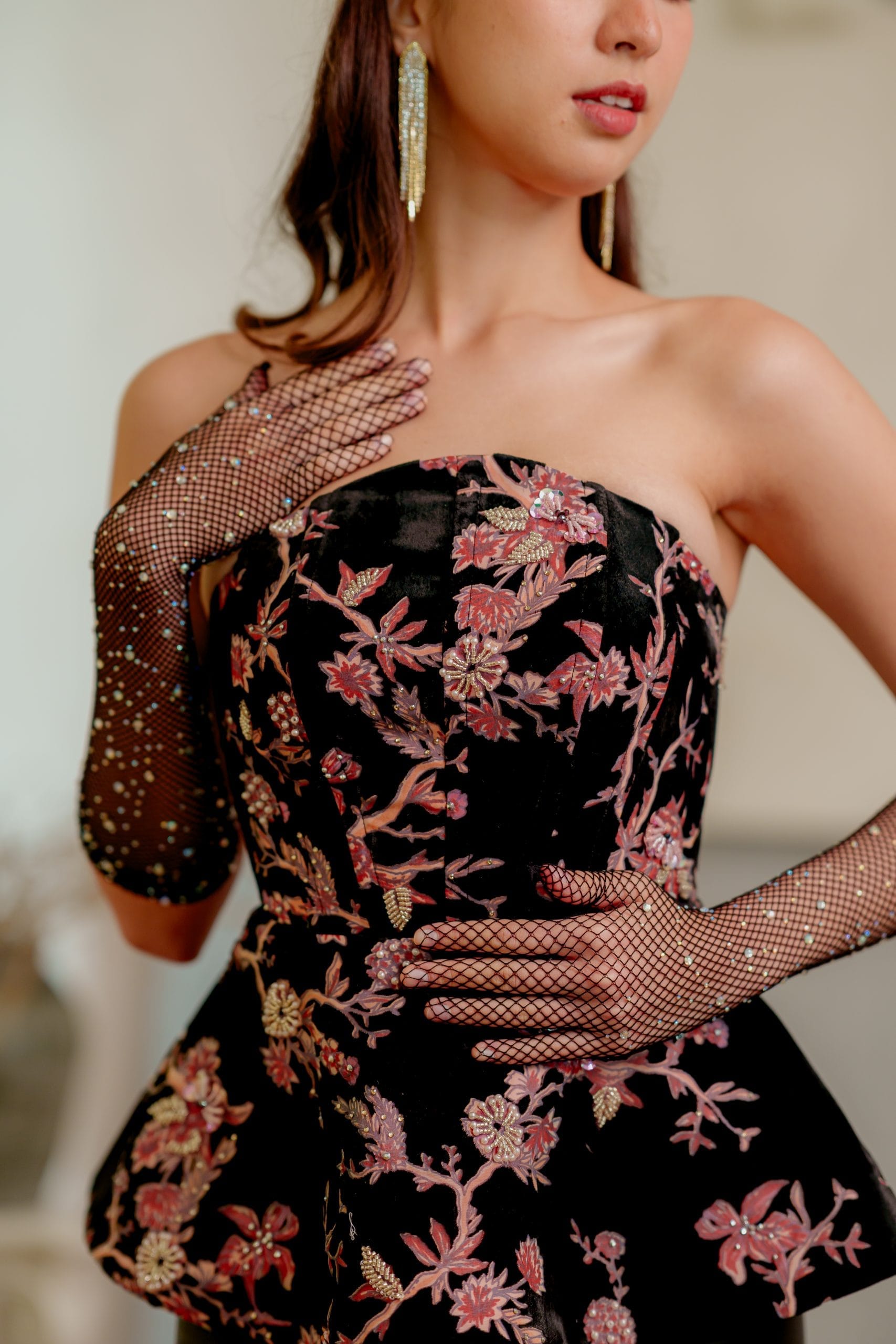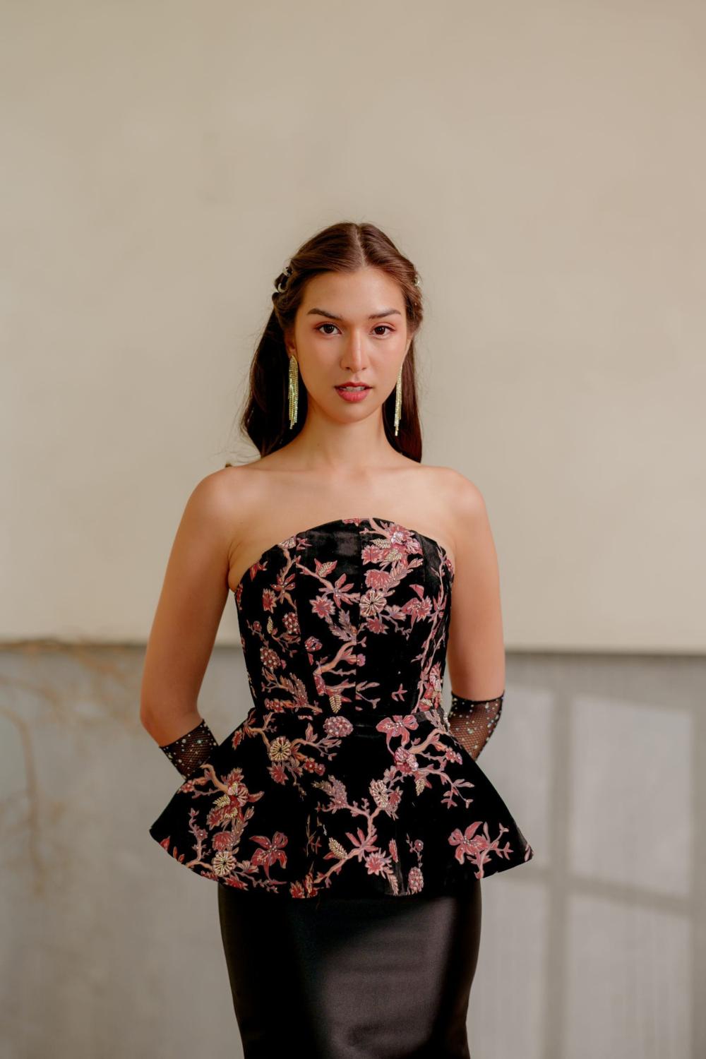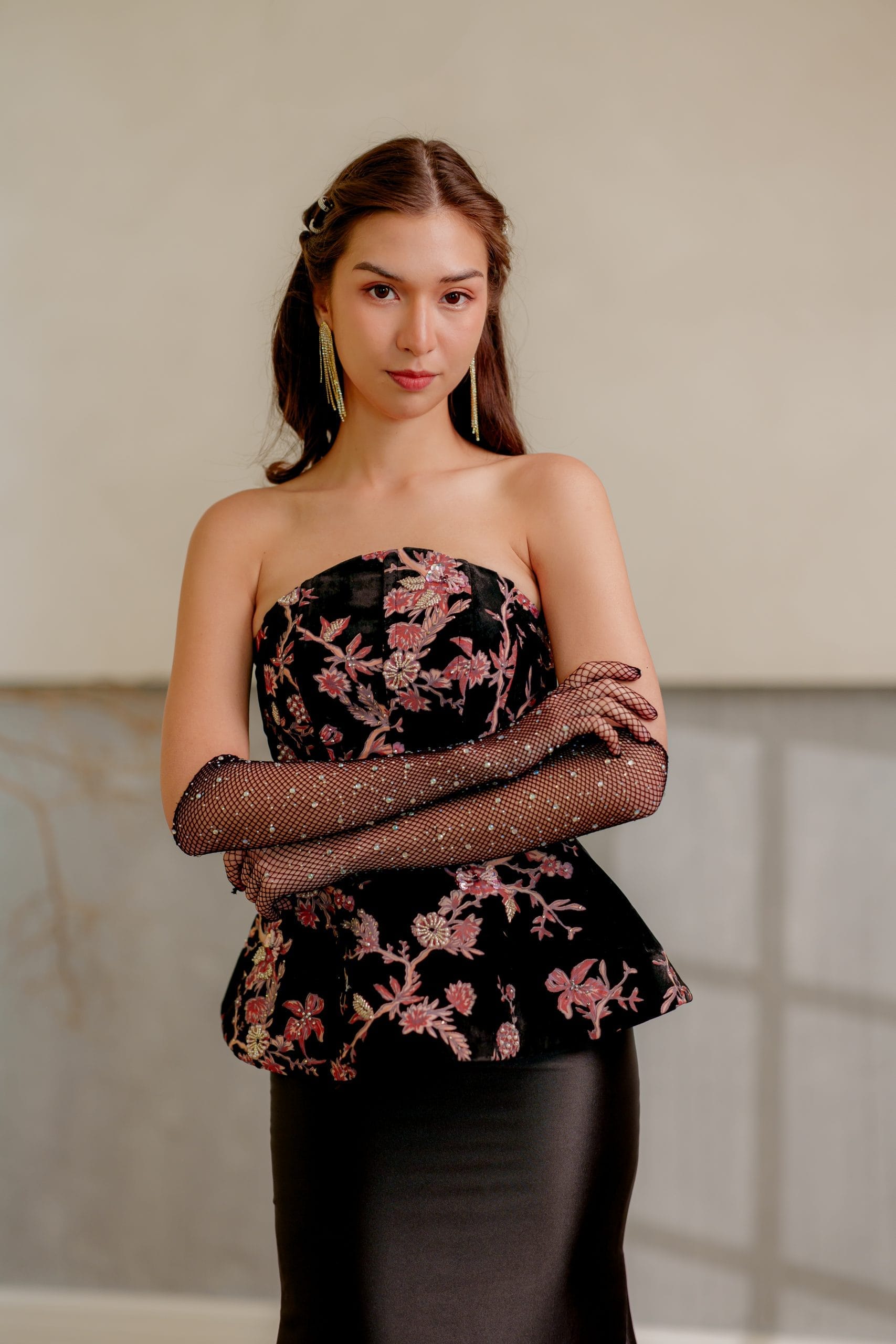 Luna in a half circular strapless corseted top