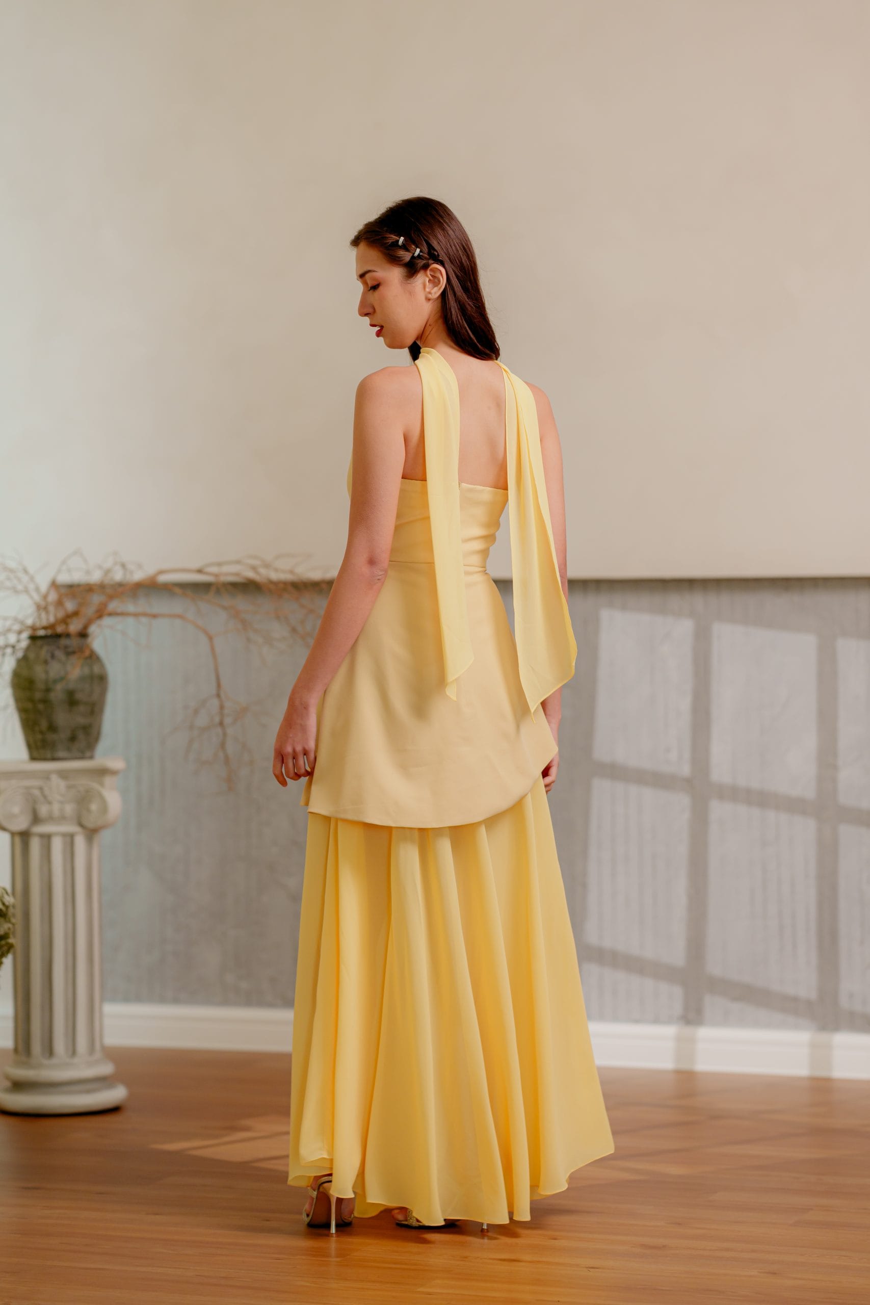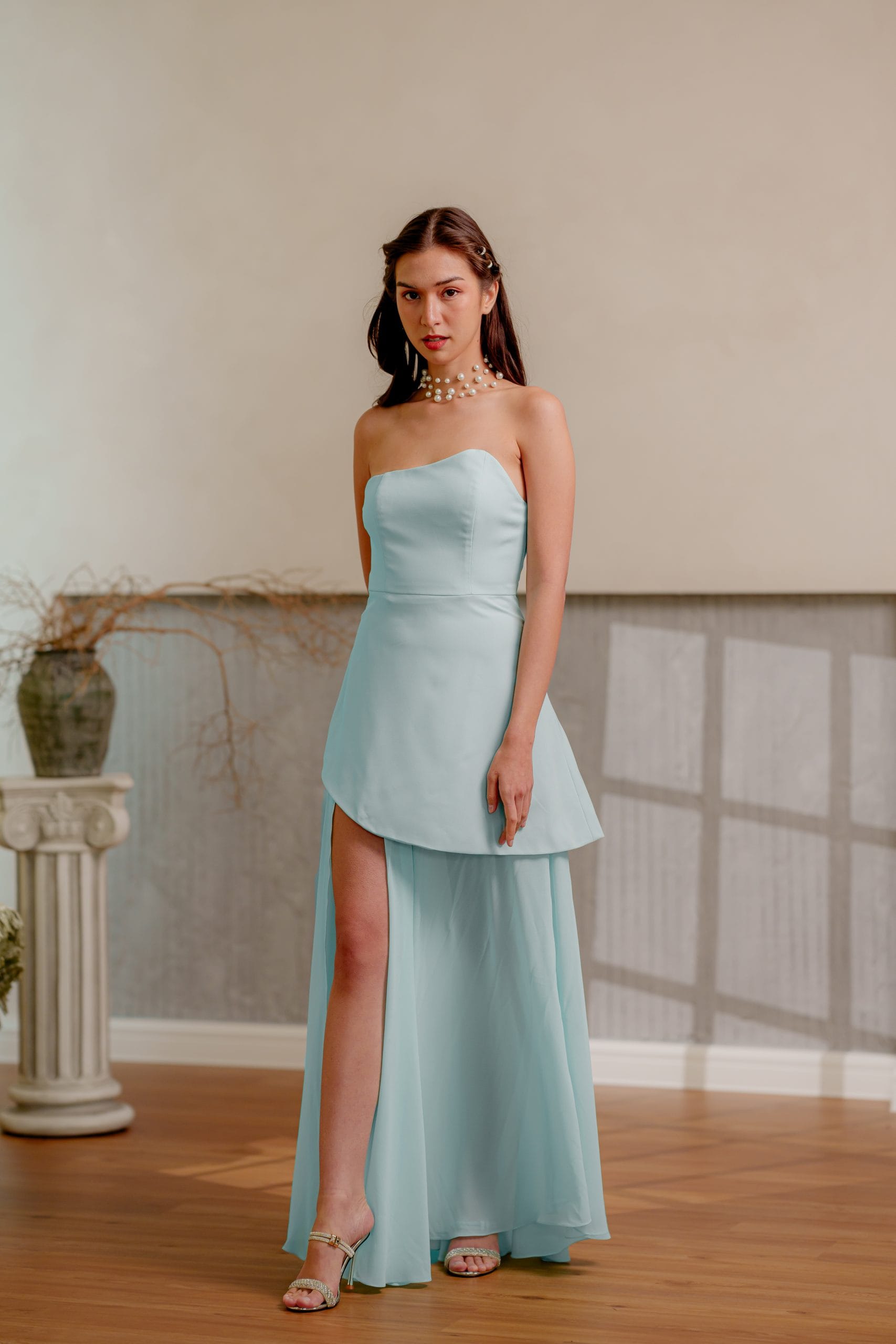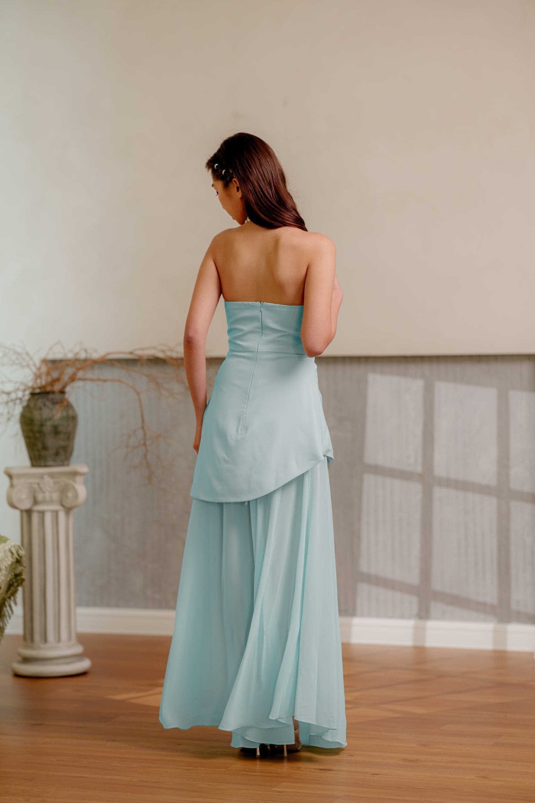 Willow is a two-piece look, a strapless long top and a translucent chiffon wraparound skirt